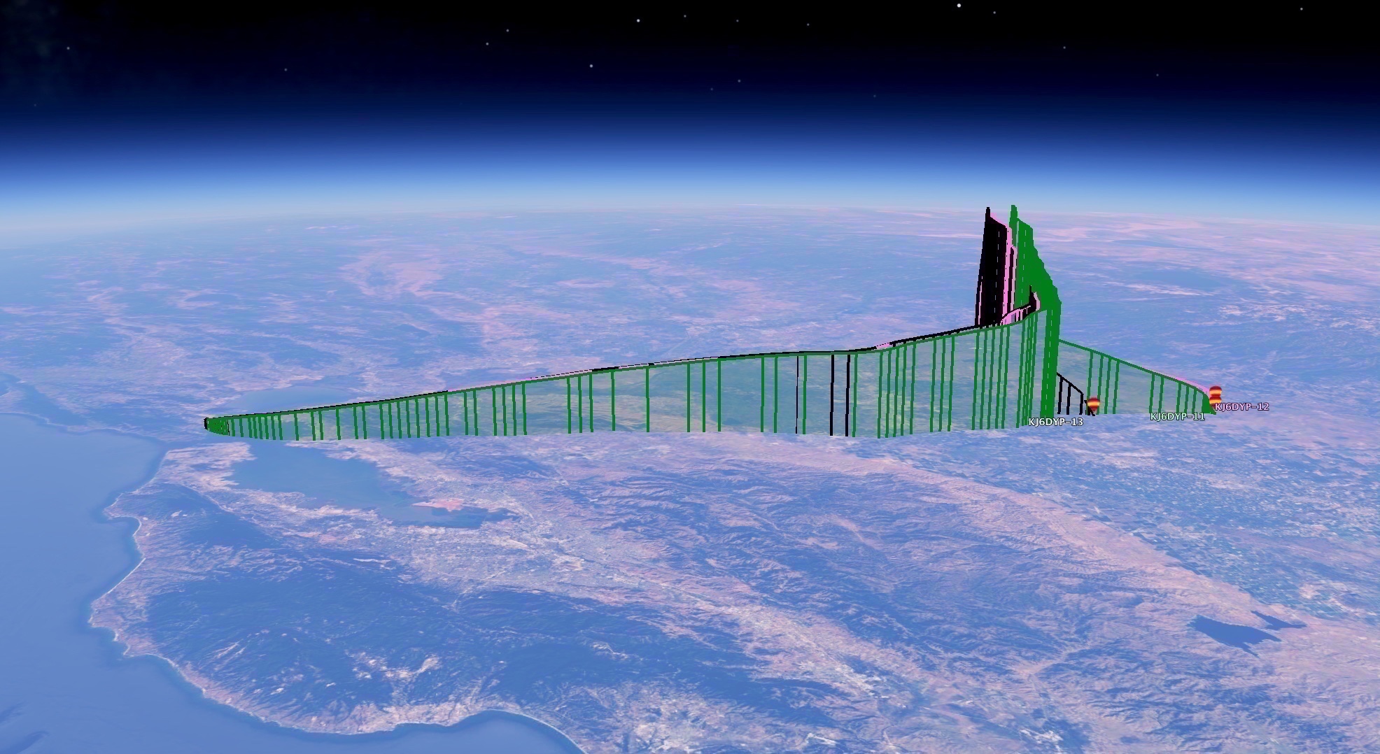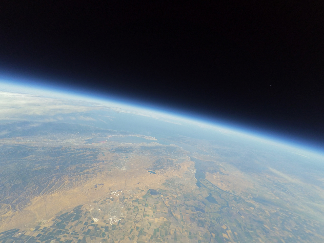 From 103,769 feet, both Midnight and Dusk balloons were clearly visible 2.5 miles away from Dawn as they rose to burst altitude east of Manteca