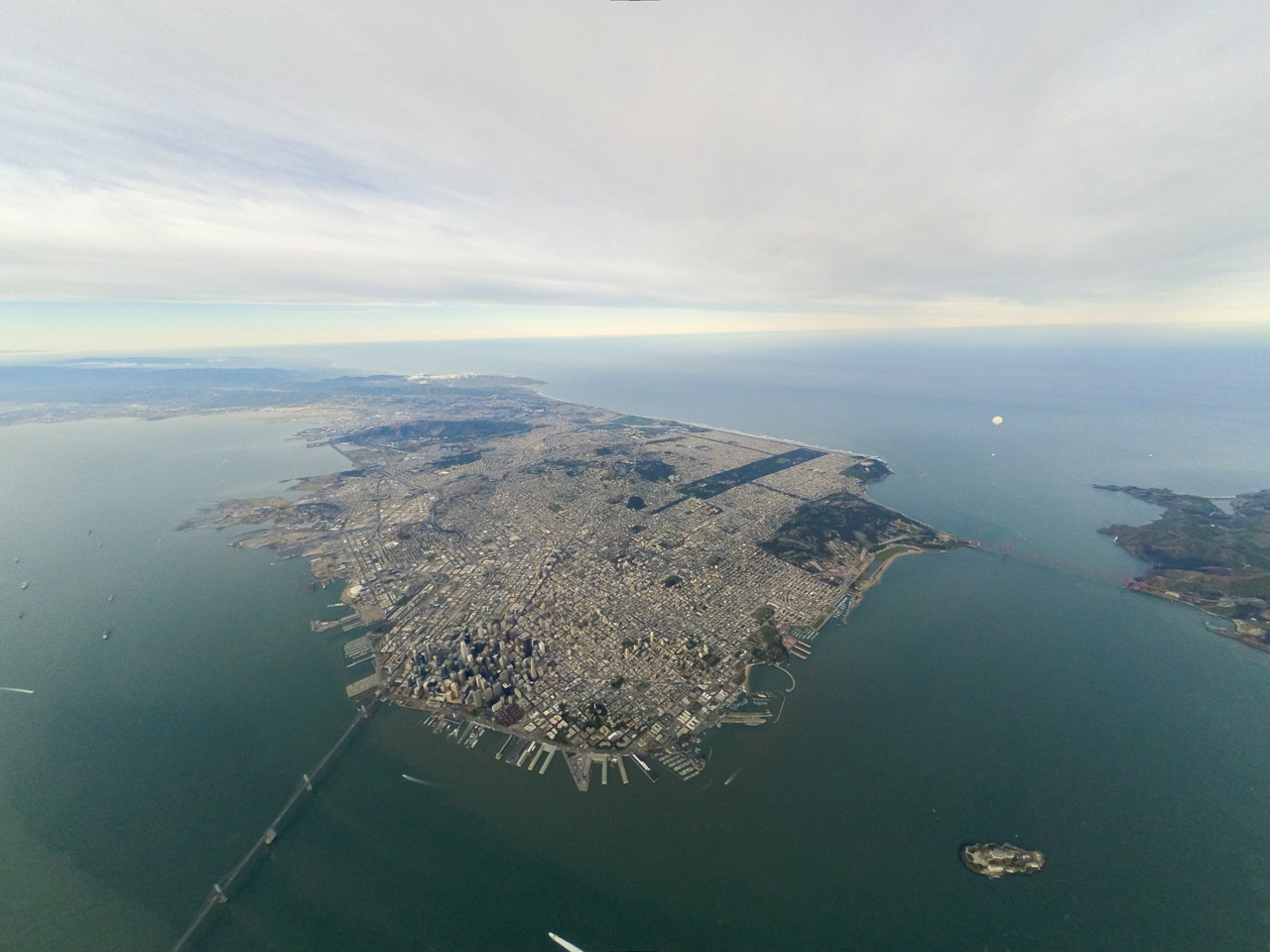 Downtown San Francisco from 11,538 feet with Midnight and Dawn balloons over Alcatraz