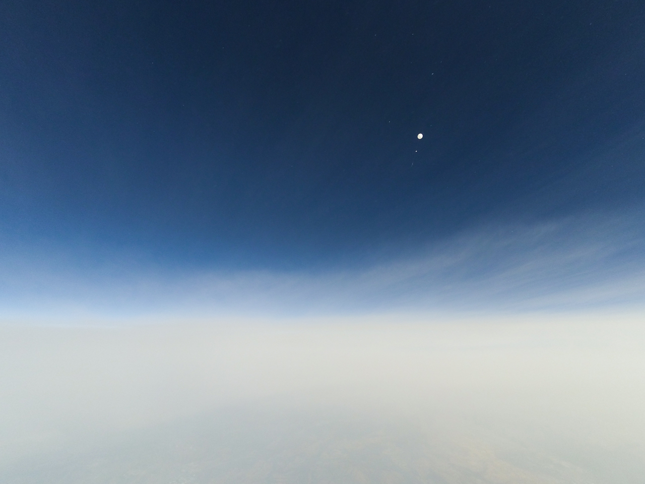 Midnight balloon floating out the top of the cirrostratus cloud layer with individual ice particles visible. Taken from 35,225 feet; other balloon is 255 feet higher.
