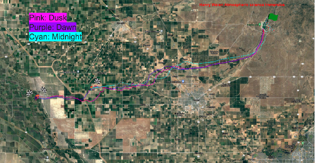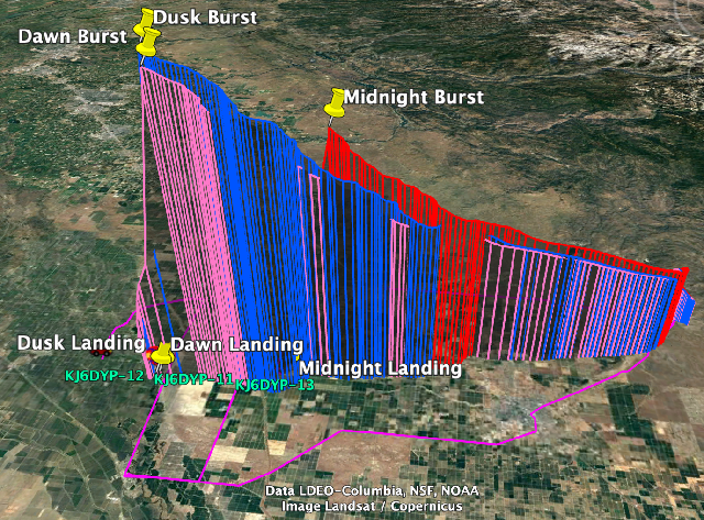 Midnight burst at 86,581 feet after merely 2 hours and 22 minutes of flight time. After falling for 26 minutes, Midnight was retrieved by both students and teachers around noon. Dawn and Dusk flew higher, reaching final heights of 103,609 feet and 108,087 feet, respectively. Dawn burst 3 hours and 26 minutes after launch then landed at 12:05 P.M. also falling for 26 minutes. Dusk burst 3 hours and 31 minutes after launch then landed 21 minutes later in unison with Dawn at 12:05 P.M. Alumni from the Bay School crossed the San Joaquin river and found one payload on their own and found the second with the help of an orchard manager.